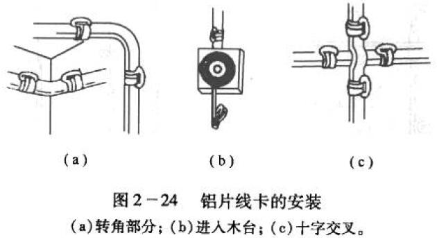 (3)固定线卡。线卡的规格有1号、2号、3号和4号等。在室内外照明电路中通常用1号线卡。在北方还大量使用塑料卡钉方法与固定线卡相同。