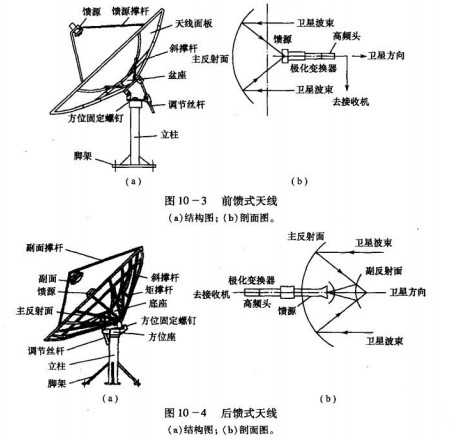 卫星接收天线的形状:反射面呈抛物面形,分为板状天线和网状天线,天线的口径从直径 0.25m~7.6m。反射面一般为6瓣〜8瓣,安装时组成一个整体。天线按馈电方式分为前馈 式和后馈式,如图10-3、图10-4所示。后馈式效果好但价格昂贵,一般使用前馈板状天线。卫星天线安装时,通常把脚架固定在地脚螺栓上,用钢筋或角铁从3个方向拉紧,再固定在屋顶或地面上。