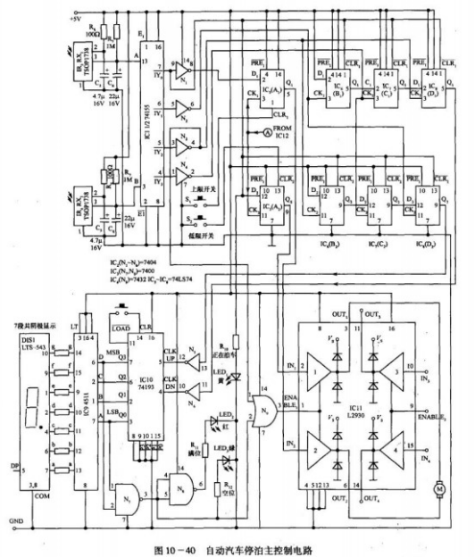 自动汽车停泊控制电路如图10-39和图10 -40所示使用了 NE555定时器IC.74LS74D 触发器,74155 2/4译码器,二进制加/减计数器74193,7段码显示驱动器CD4511,小型电机驱 动电路1293D,与非门集成电路7400和非门7404。此外电路还使用了两个NSOP1738红外接 收模块,2个红外线发射用LED管,7段码显示器,以及红、绿、黄色的发光二极管各1个和3 个微动开关。 -