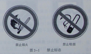 禁止标志的含义是禁止人们不安全行为的图形标志。几何图形为白底黑色图案加带斜杆的红色圆环,并在正下方用文字补充说明禁止的行为模式。图3-1为施工现场常见的两种禁止标志:禁止烟火和禁止吸烟。