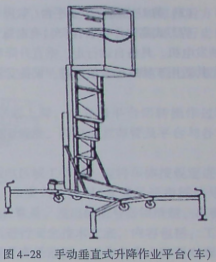 手动垂直式升降作业平台(车)是一种结构简单,操作方便,载重量较小,作业高度较低的作业平台(车),靠摇动手柄传递于链条或齿轮,使作业平台升降。见图4-28。