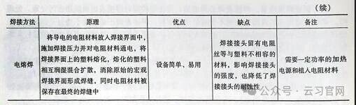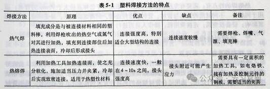 特种设备塑料焊接中主要用加热焊接法,塑料加热焊接主要有三种方法:热气焊、热熔焊和电熔焊。表5-1是塑料焊接方法的特点。