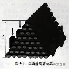 4)管材堆放应下重上轻,防止重压变形。当直管堆放采用三角形和两侧加支撑保护的矩形形式时堆放高度不宜超过1.5m,如图4-9所示。当直管采用分层货架存放时,每层货架高度不宜超过1m,堆放总高度不宜超过3m。