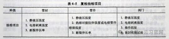 进行复检时,可以根据管材、管件、阀门的数量,按照一定比例进行抽检,检测项目主要包括性能和熔接强度两方面。表4-5中为复检抽检项目。