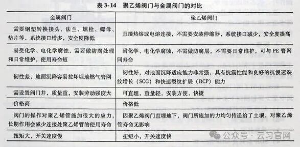 与金属阀门相比,聚乙烯阀门具有很多优点,无论是安全性、韧性和寿命,还是价格,PE阀门都有一定优势,这些优点使得聚乙烯阀门在我国的使用量逐年增长,广泛应用于我国聚乙烯燃气和给水管网中,并实现了向澳大利亚、美国、欧洲出口。聚乙烯阀门与金属阀门的对比见表3-14。