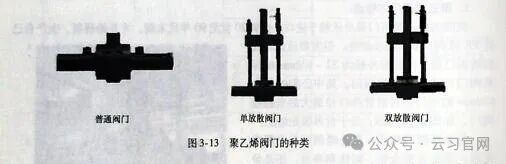 另外,聚乙烯阀门按阀门的流通情况可分为全通径阀门和非通径阀门,按阀门的放散管数量可分为普通阀门、单放散阀门、双放散阀门,这三类阀门可以根据使用者要求和具体应用情况进行选择,如图3-13所示。