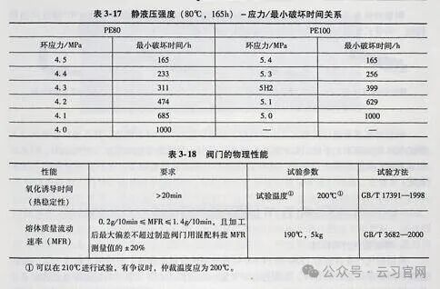 在进行(80℃,165h)的静液压试验时,仅考虑阀门出现的脆性破坏,如果在规定破坏时间前发生了韧性破坏,允许在较低的应力下重新进行该试验,如果试验通过,即认为合格。重新试验的应力及其最小破坏时间可从表3-17中选择,也可从应力-时间关系曲线上选择。