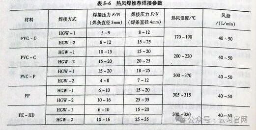 成,切削加工后的表面以及焊条必须保持清洁,不被污染。对焊接表面作脱脂去污处理时,不得进行可导致塑料溶解或膨胀的处理。热风焊一般在水平位置进行,焊条应紧顶在焊道坡口的焊接表面上,然后用热风均匀地对其及母材加热,直至熔融焊合。