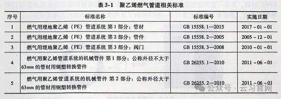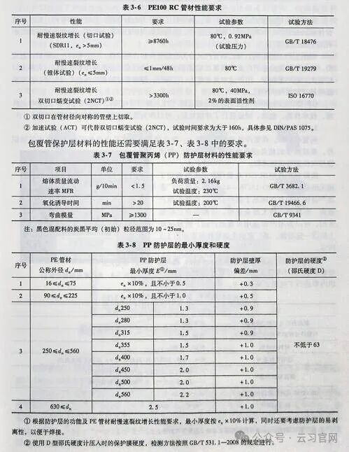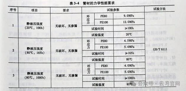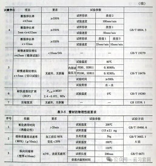 GB15558.1—2015中对聚乙烯管材各项性能和检验方法进行了细致规定,是判断管材和生产企业质量控制情况的主要依据,管材的力学性能要符合表3-4的要求,管材的物理性能要符合表3-5的要求。