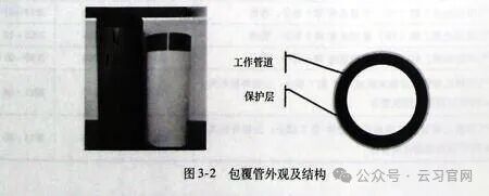 聚乙烯管材按照结构划分,可分为单层实壁管材、具有防护层的实壁管材(以下简称包覆管)和多层管道。单层实壁管材是一次性挤出成型的管材,是传统的聚乙烯管材类型,管壁直接承受管道内部压力及环境应力。而包覆管则是近年来国内新开发的一种产品,是在传统单层实壁管材挤出完成后,使用专用挤出机在管道外部挤出一层保护层,包覆管外观及结构如图3-2所示。内部的工作管道用于承受工作压力,保护层用于抵抗在运输、存储、拖拉等过程中可能受到的略伤、划伤等外力破坏。包覆管的保护层通常为硬度更高的聚丙烯(PP)材料,具有一定厚度要求,除了防止划伤外,还具有隔离紫外线氧化破坏和阻碍白蚁啃咬的作用。多层聚乙烯管主要用于一些特殊的工业环境,我国市政行业尚未使用。