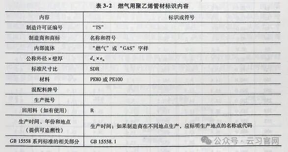 除颜色要求外,燃气管材上还必须打印明显的其他标识,其颜色要区别于管材的颜色便于识别。其他标识的内容包括生产商、原材料等,要能够显示管材质量和使用的相关信息,表3-2中是燃气用聚乙烯管材标识必须打印的内容。这些信息对管材的质量追溯起着关键作用。