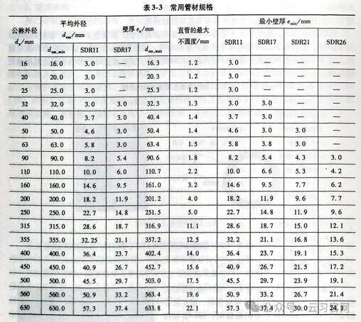 表3-3中列出了常用的管材规格,也是我国燃气用聚乙烯管材公称外径允许使用的范围,即16~630mm。目前国内在用的最大口径聚乙烯燃气管道是公称外径为560mm用于输送焦炉煤气的管材。近年来,在给水排水等行业的应用中,更大口径的聚乙烯管材也已经得到了应用,最大口径可达到1200mm以上。