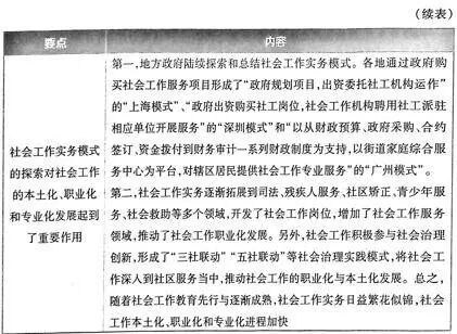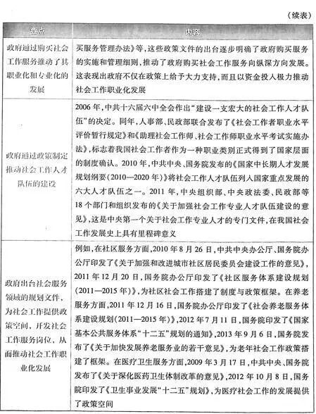 社会工作的繁荣发展时期始于2006年党的十六届六中全会《中共中央关于构建社会主义和谐社会若干重大问题的决定》提出的“建设宏大的社会工作人才队伍”,自此,社会工作进入了快速增长的时期。(1)社会工作实务的推进。伴随着社会工作教育的恢复与重建,社会工作实务逐渐兴起,并从社区逐渐推广到医务、司法、卫生、灾害等各个领域,推动了社会工作的职业化发展。