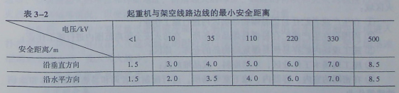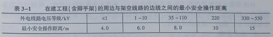 (2)在建工程(含脚手架)的周边与外电架空线路的边线之间的最小安全操作距离应符合3-1规定。