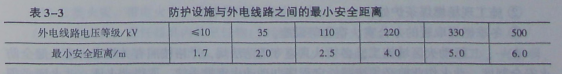 防护设施与外电线路之间的安全距离不应小于表3-3所列数值。防护设施应坚固、稳定,且对外电线路的隔离防护应达到IP30级。