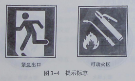 提示标志的含义是向人们提供某种信息(如标明安全设施或场所等)的图形标志。图形以正方形、绿底(防火为红色)白线条加文字说明。图3-4为两种常见的提示标志:紧急出口和可动火区。