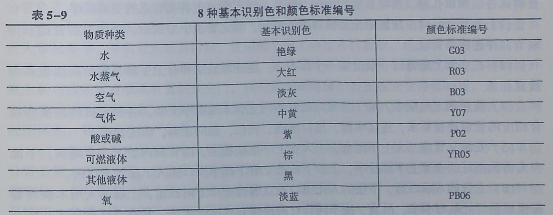 (1)根据《工业管路的基本识别色、识别符号和安全标识》(GB7231—2003),规定了8种基本识别色,见表5-9。